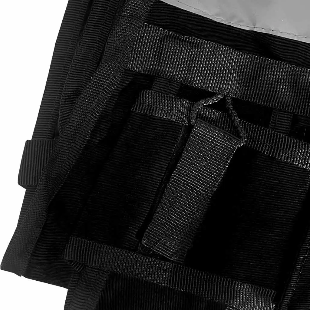 Incluye cierre de seguridad tipo zipper negro de 40 cm, bies de polipropileno de alta resistencia y hebillas de ajuste laterales que permiten un ajuste firme y personalizado.